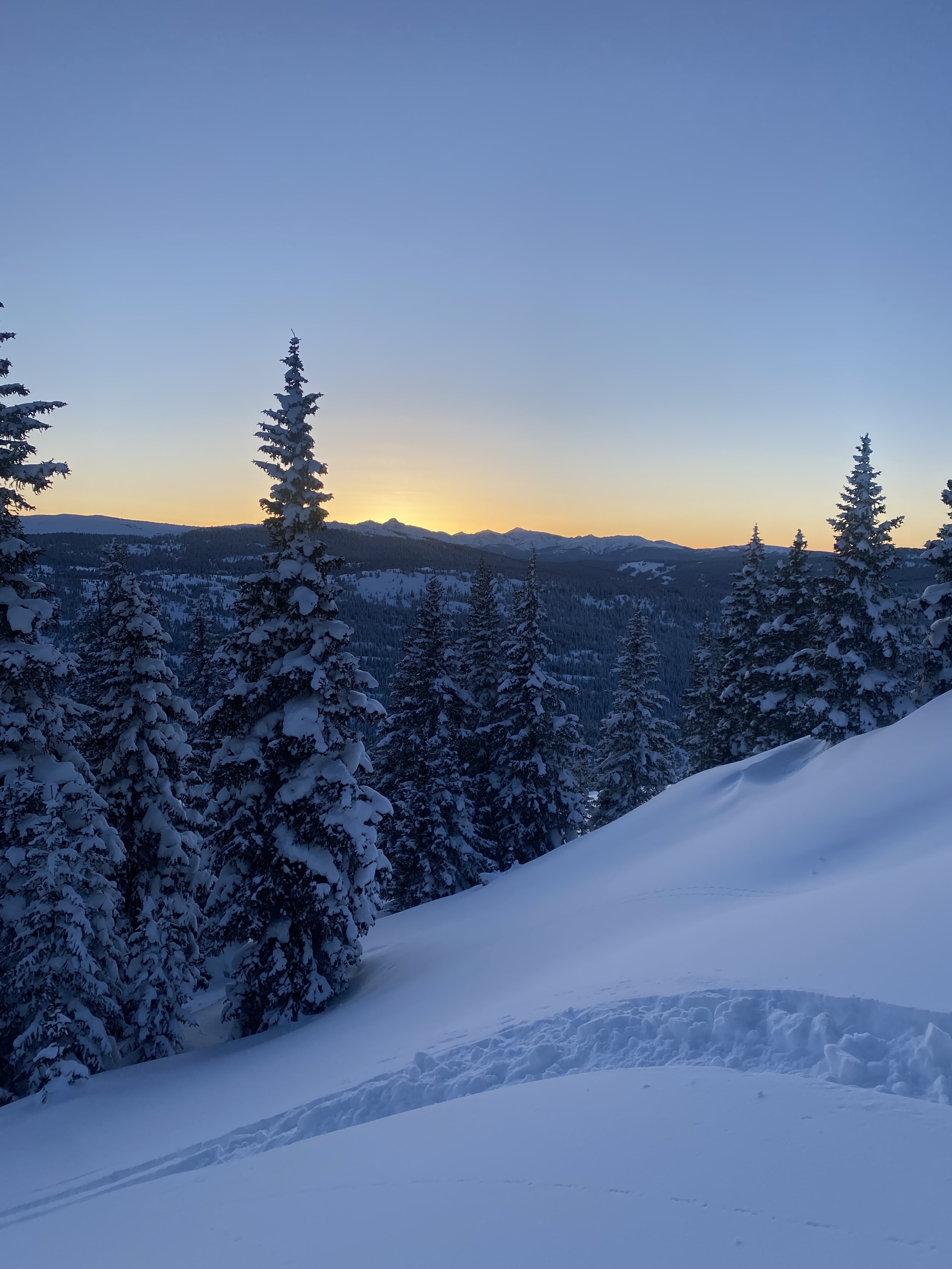 Temps were quite cold, below 10 F, as we got started. The sun was setting, but we figured we could make it out to a less-trafficked zone for some solitude and fresh snow. As we gained the skin track and got above the trees, we got our first glimpse of the sunset.